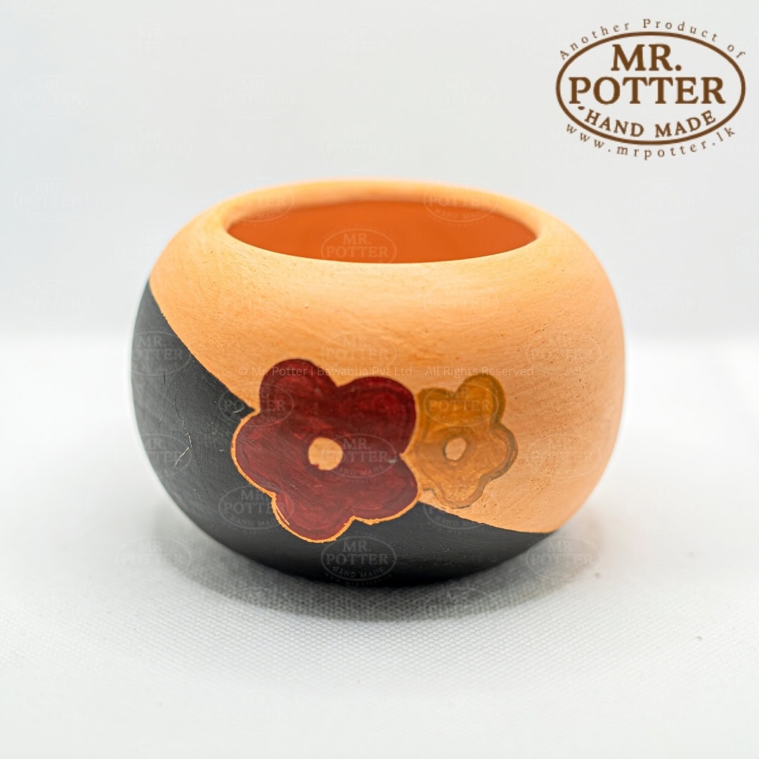 Brighten up your space with this artistic Round Clay Pot. Featuring a stylish diagonal two-tone design (Matte Black & Natural Terracotta) and hand-painted floral accents, this handcrafted pot is a vibrant home for your succulents or small indoor plants.