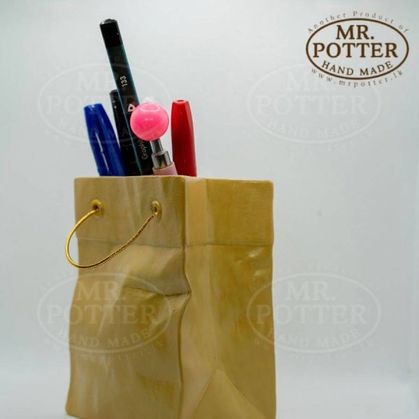 Add a touch of creativity and luxury to your workspace with the Bag-Shaped Pencil Holder by Mr. Potter. Handcrafted from natural clay and finished in a rich golden hue, this unique piece blends functionality and artistry — perfect for those seeking handmade desk organizers, gift-inspired décor, and symbolic keepsakes that represent giving, gratitude, and abundance.